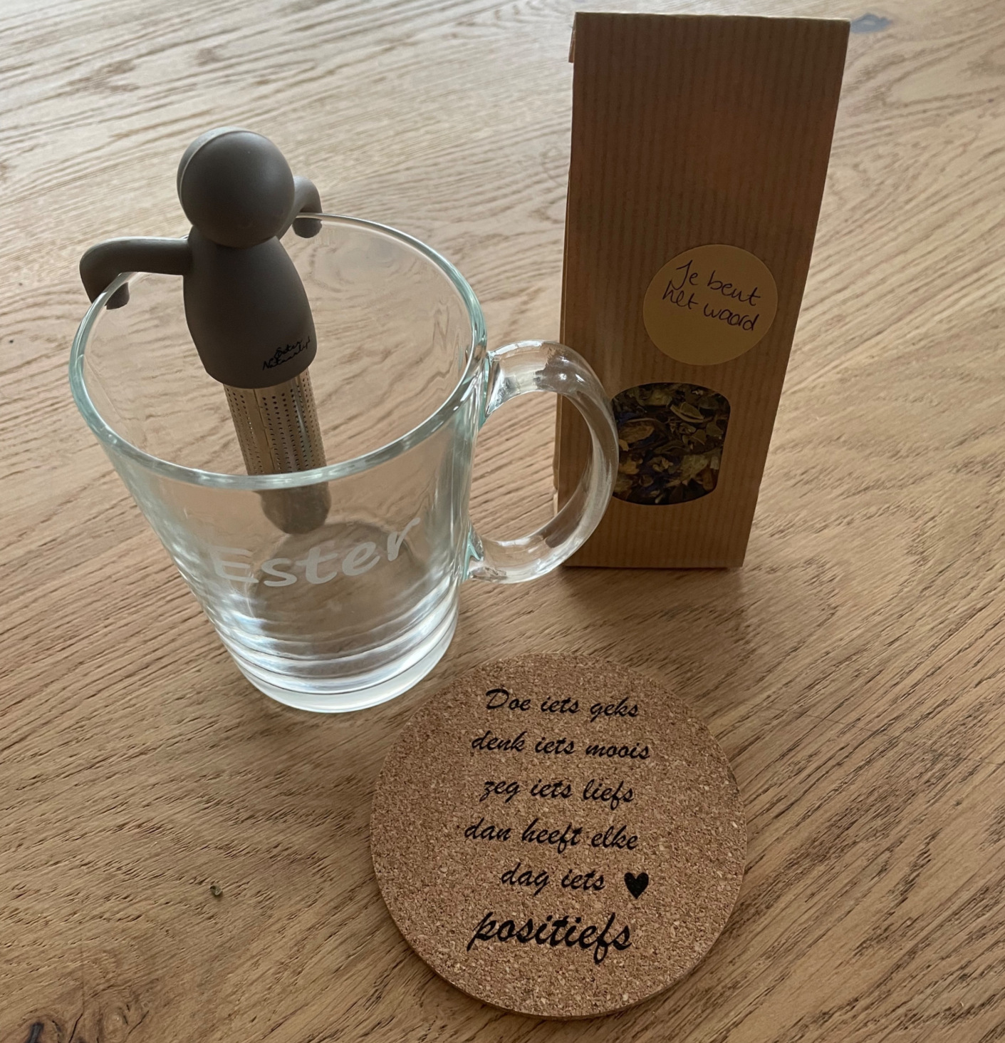 Optioneel: personalisatie in de vorm van een andere soort thee of de tekst of een logo op het glas of de onderzetter.