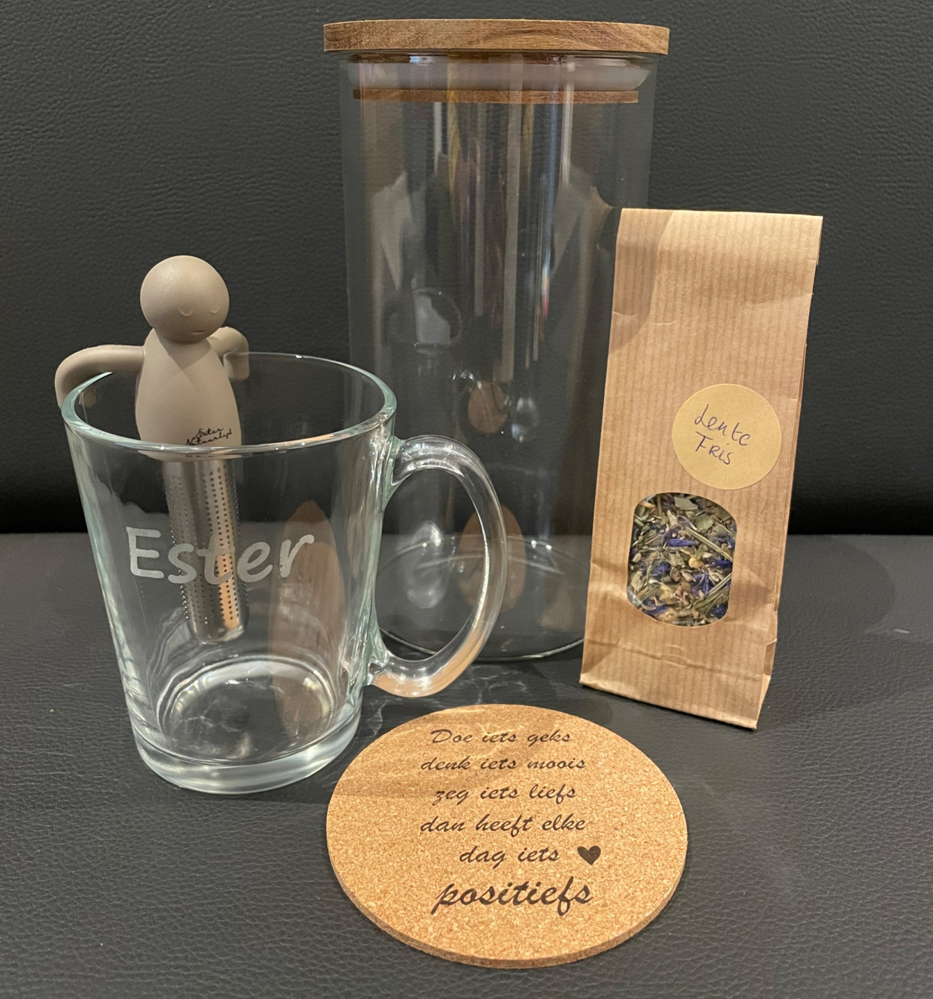 Optioneel: personalisatie in de vorm van een andere soort thee of de tekst of een logo op het deksel of bewaarglas of de onderzetter.