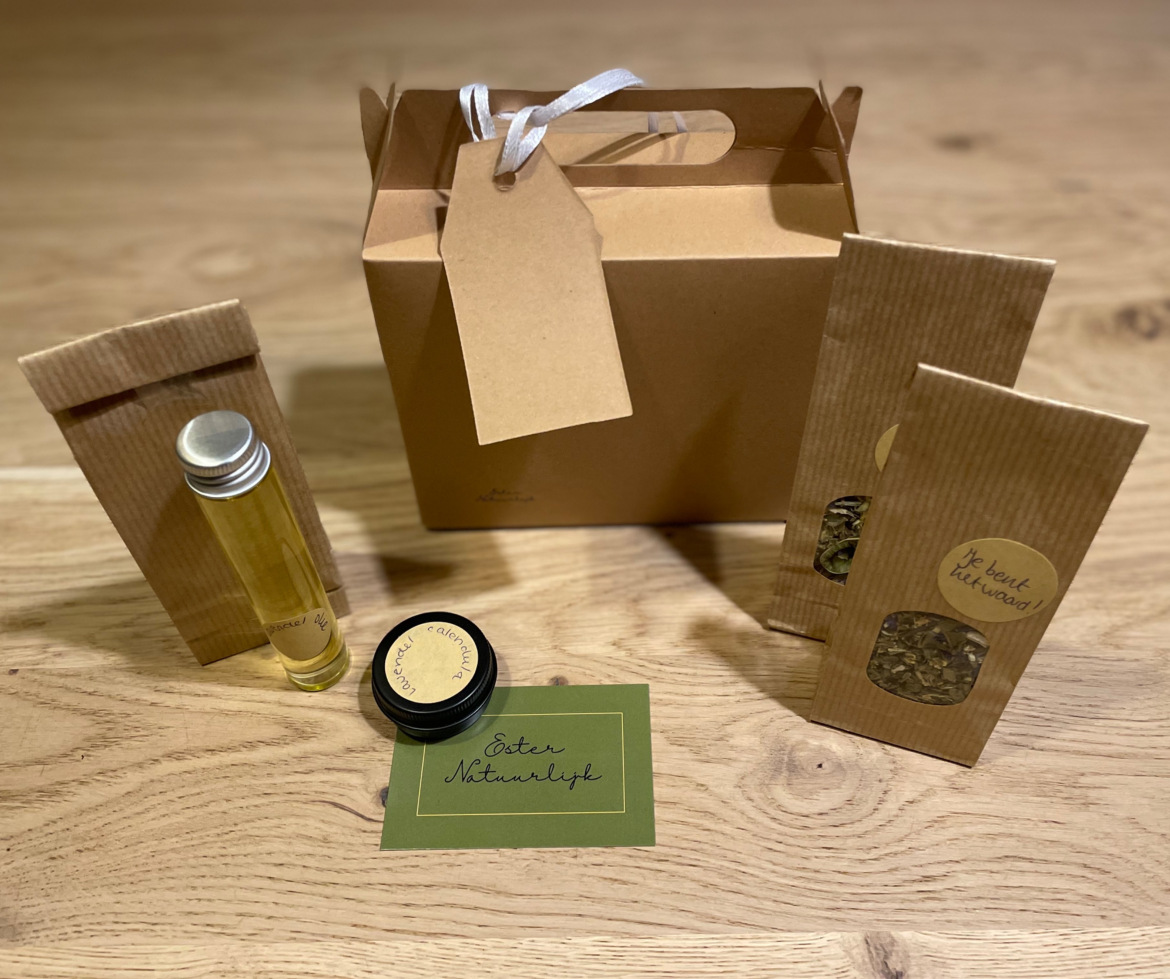 Een lavendel-calendula (goudsbloem) zalf is toegevoegd aan dit pakket. De zalf is gemaakt op basis van amandelolie. Goudsbloem en lavendel is gedurende 8 weken toegevoegd. Waarna met behulp van bijenwas deze olie verwerkt is tot zalf. De lavendel werkt kalmerend en heeft een opschonende werking. In combinatie met calendula welke een huidherstellende werking heeft, is dit een milde, verzachtende zalf. De zalf is te gebruiken op droge plekjes en bijvoorbeeld eczeem.